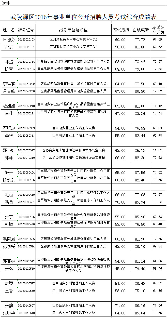 武陵源區(qū)2016年事業(yè)單位公開招聘人員考試綜合成績公布