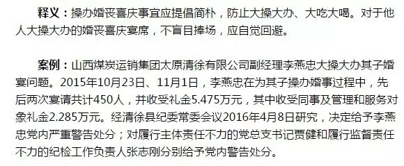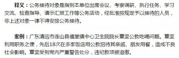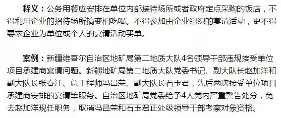 釋義:不得以任何名義新建、改建、擴(kuò)建或超標(biāo)準(zhǔn)裝修、裝飾單位內(nèi)部接待場(chǎng)所,同時(shí)內(nèi)部接待場(chǎng)所必須嚴(yán)格按照公務(wù)接待標(biāo)準(zhǔn),不得變相搞大吃大喝。