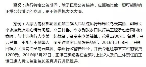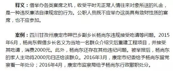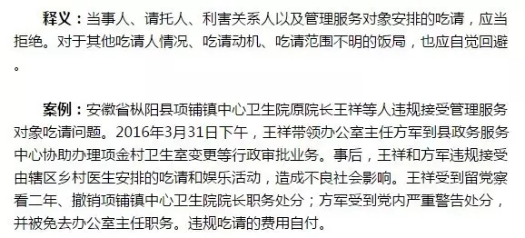 釋義:吃請(qǐng)聚會(huì)既要遵守黨紀(jì)條規(guī),分清時(shí)間場(chǎng)合;也要尊重當(dāng)?shù)匾恍╋L(fēng)俗習(xí)慣,注意社會(huì)影響。對(duì)于一些明顯違反紀(jì)律規(guī)定、違背公序良俗、可能損害黨員干部隊(duì)伍形象的飯局,應(yīng)自覺(jué)回避。