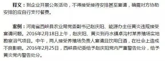 釋義:到村級(jí)組織開(kāi)展公務(wù)活動(dòng),原則上應(yīng)自行安排用餐,不得接受接待安排甚至宴請(qǐng);確需對(duì)方協(xié)助安排的,應(yīng)自行支付餐費(fèi)。