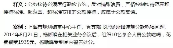 釋義:市區(qū)或同一縣(區(qū))各部門(mén)之間的公務(wù)活動(dòng),應(yīng)個(gè)人自行安排用餐,既不得使用本單位公款買(mǎi)單,也不能接受公款接待。