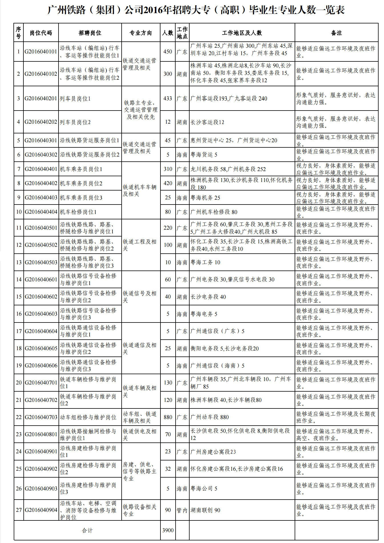 本批次計(jì)劃招聘鐵路主專業(yè)大專(高職)畢業(yè)生3900人,具體崗位、人數(shù)、專業(yè)及要求詳見附件。