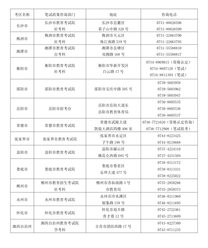 3.湖南省中小學教師資格考試筆試各考區(qū)(市州教育考試機構(gòu))聯(lián)系地址和電話如下表:
