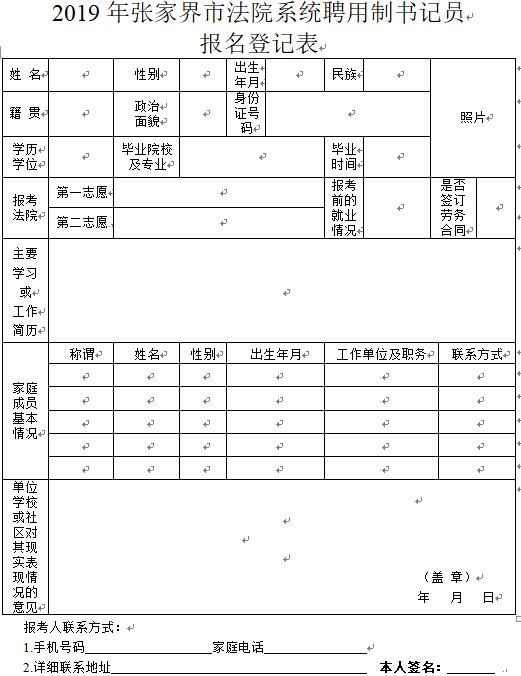 2.報(bào)名要求:報(bào)名者須填寫(xiě)《2019年張家界市法院系統(tǒng)聘用制書(shū)記員報(bào)名登記表》,一式一份,報(bào)名登記表從張家界法院網(wǎng)(http://zjjzy.chinacourt.gov.cn/index.shtml)公告欄下載,用A4幅面紙張打印,由其所在單位、學(xué)校或社區(qū)在表格現(xiàn)實(shí)表現(xiàn)情況欄提出意見(jiàn)并蓋章,持本人身份證及學(xué)歷證明等有關(guān)證件的原件、復(fù)印件,同時(shí)提供近期免冠同底1寸照片4張以及電子版照片,到所報(bào)考的法院政治部報(bào)名。