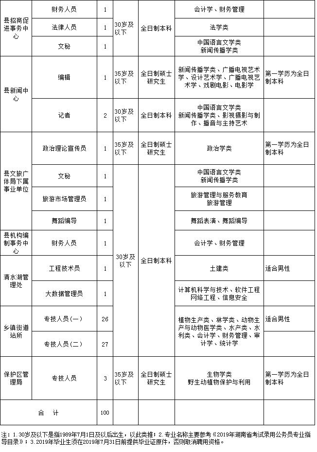招聘工作人員100名。具體崗位及數(shù)量見附表。