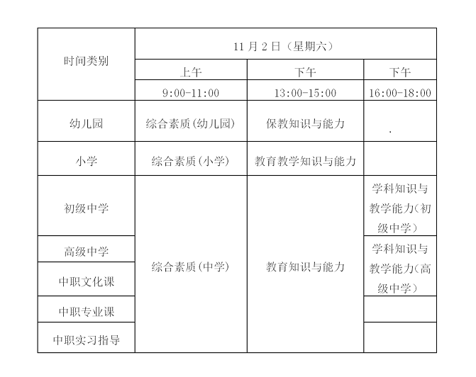 (四)全國統(tǒng)一考試時(shí)間為11月2日,各類別考試科目與時(shí)間安排如下: