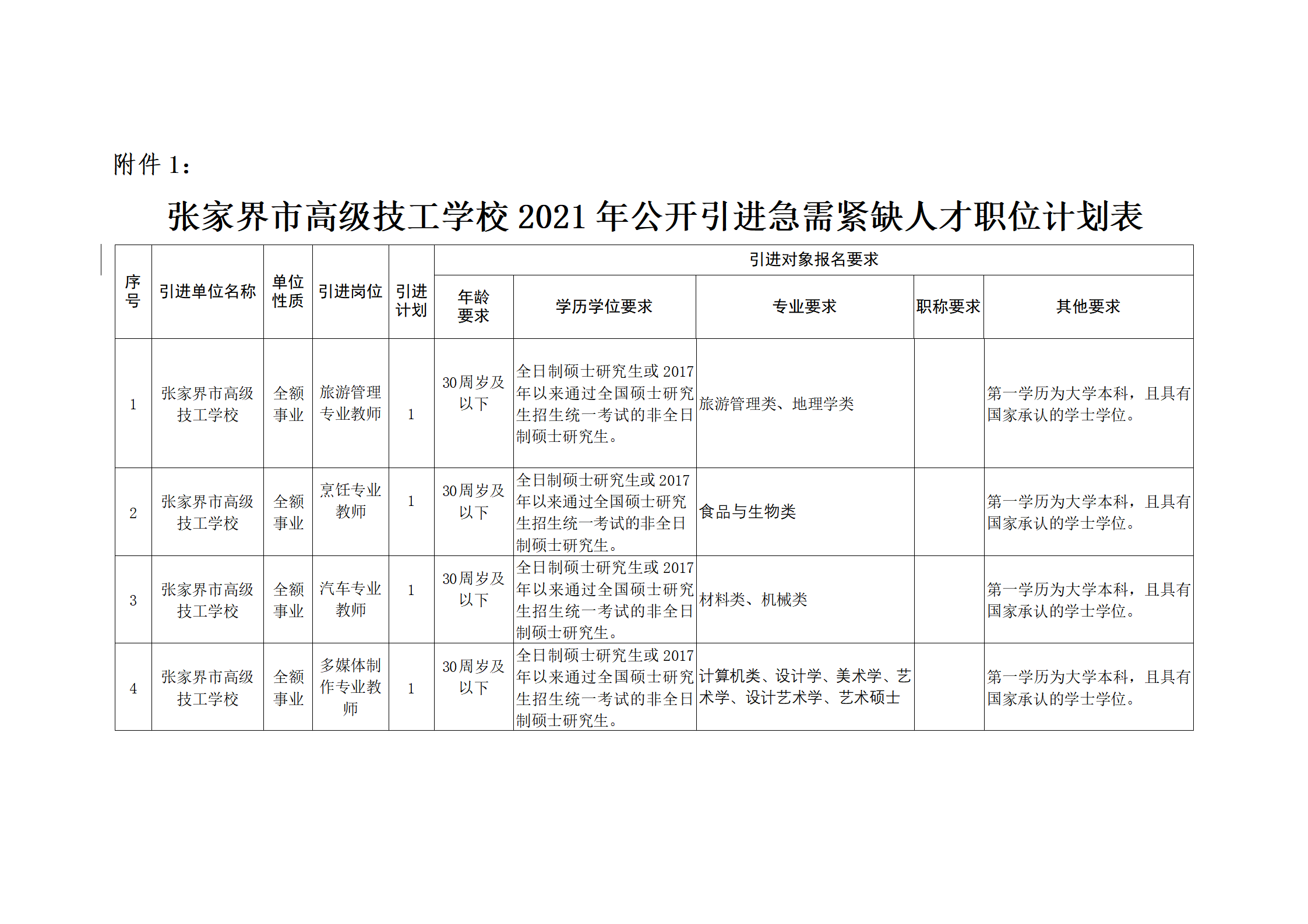 附件1:《張家界市高級技工學(xué)校2021年公開引進(jìn)急需緊缺人才職位計劃表》【附后】
